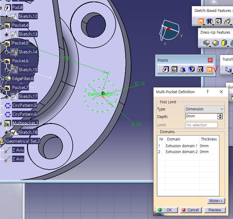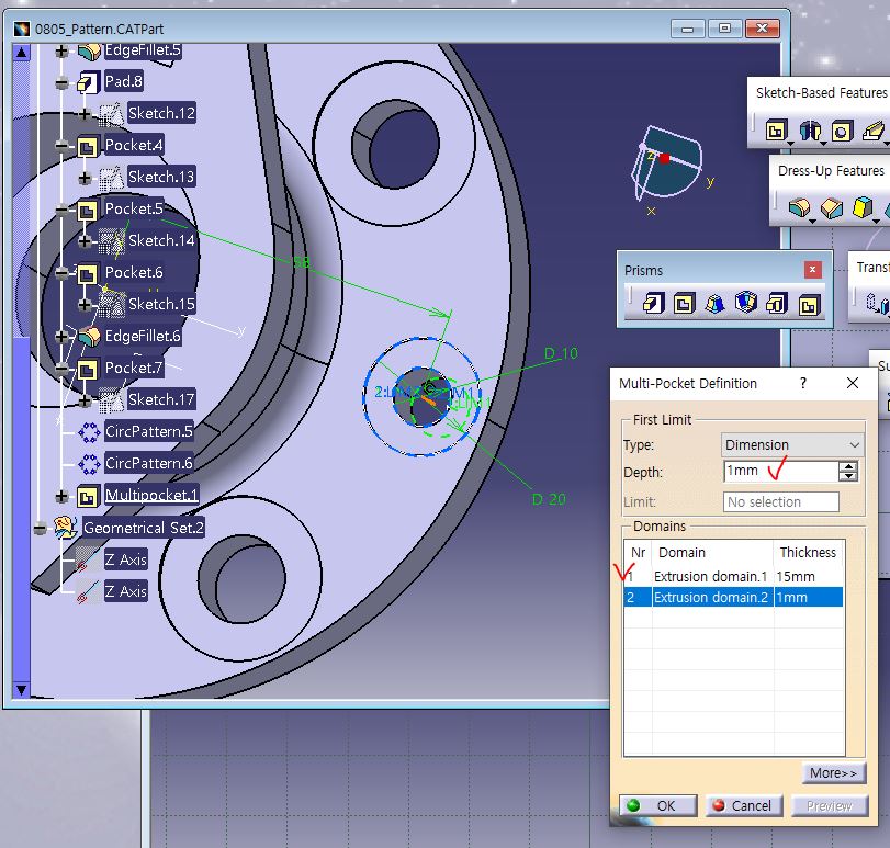 포인트를 찍어둔 스케치를 Positions에 지정하면 원하는 위치에 HOLE이나 Pocket 복사 가능